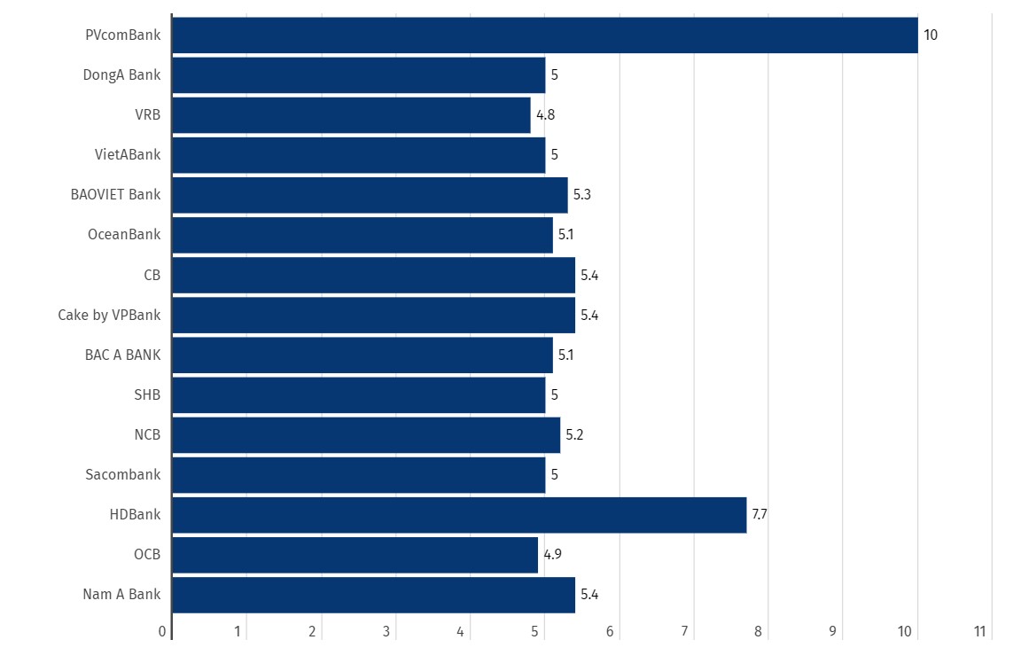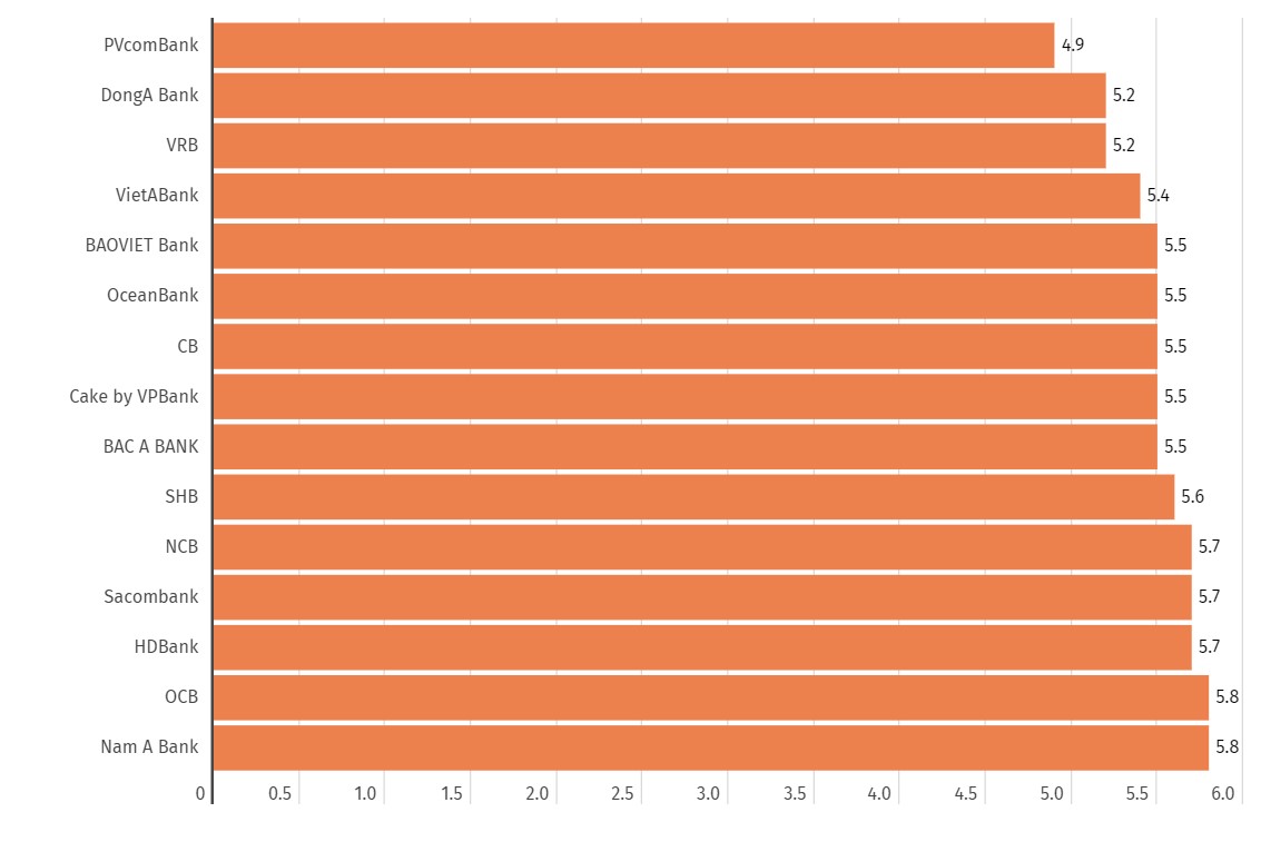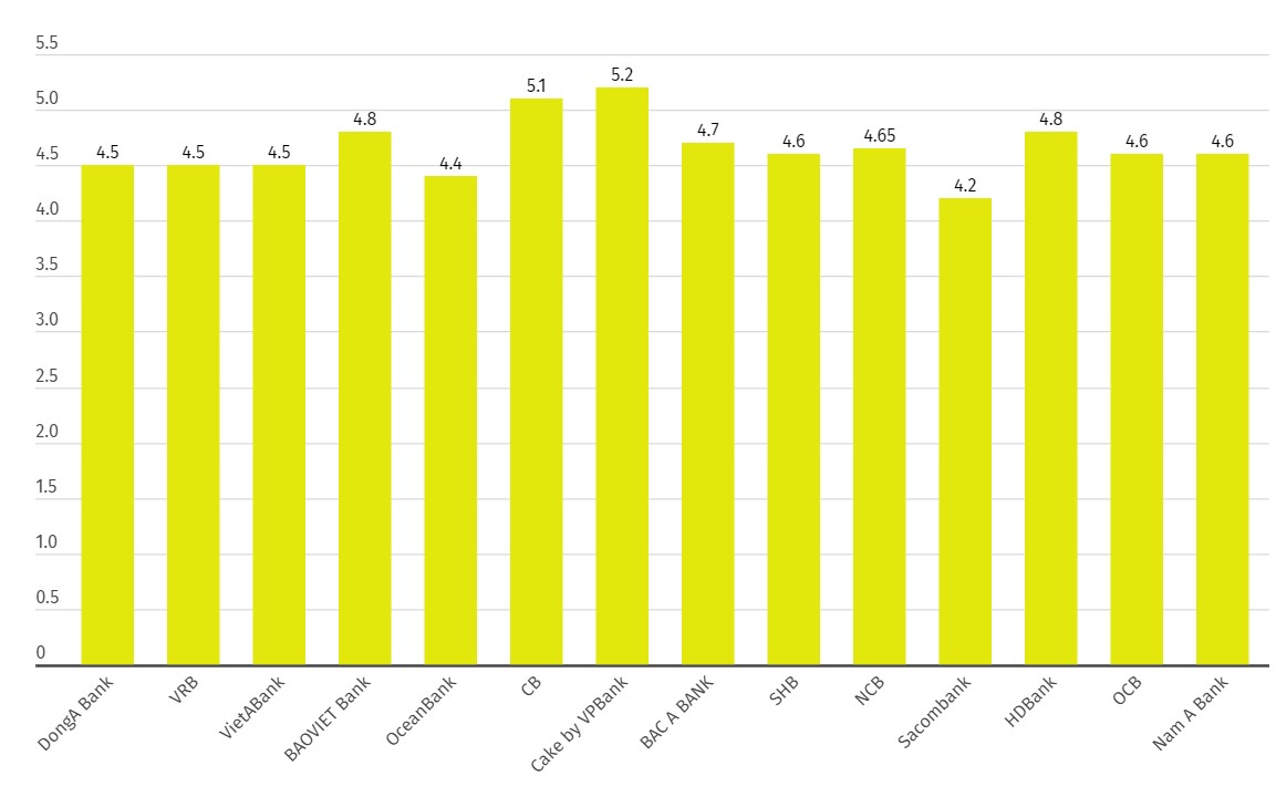 Tại kỳ hạn 6 tháng, lãi suất đang được niêm yết quanh ngưỡng 4,5-5,2%/năm. Trong đó Cake by VPBank đang niêm yết lãi suất cao nhất, ở ngưỡng 5,2%/năm. Theo sau là CB (5,1%/năm); BAOVIET Bank (4,8%/năm).