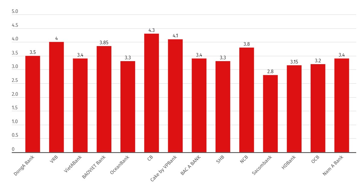 Ở kỳ hạn 3 tháng, CB đang là ngân hàng có lãi suất cao nhất (4,3%/năm). Theo sau là Cake by VPBank (4,1%/năm); VRB (4%/năm)...