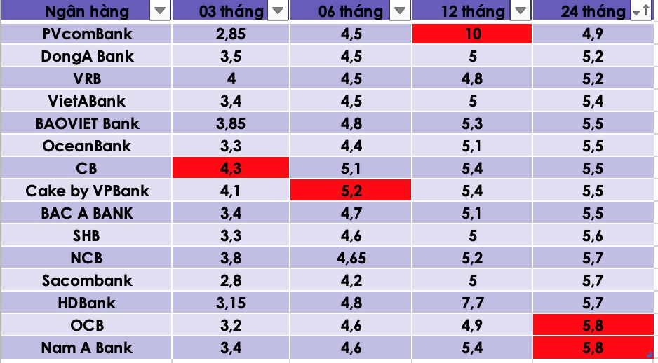 Đối với kỳ hạn 24 tháng, lãi suất niêm yết quanh ngưỡng 4,9-5,8%/năm. Trong đó lãi suất cao nhất thuộc về OCB và Nam A Bank (5,8%/năm). Theo sau có thể kể đến HDBank, Sacombank, NCB (5,7%/năm)...
