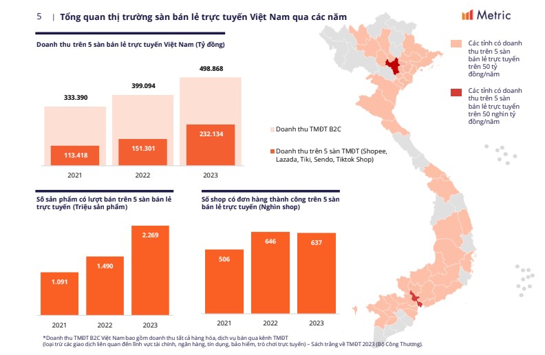 Theo nền tảng số liệu thị trường Metric (Metric) ghi nhận từ ngày 1.1 đến 31.12.2023, doanh thu toàn thị trường thương mại điện tử B2C (doanh nghiệp đến khách hàng) năm 2023 đạt 498.868 tỉ đồng, vượt xa so với năm 2022 (hơn 399.000 tỉ đồng).