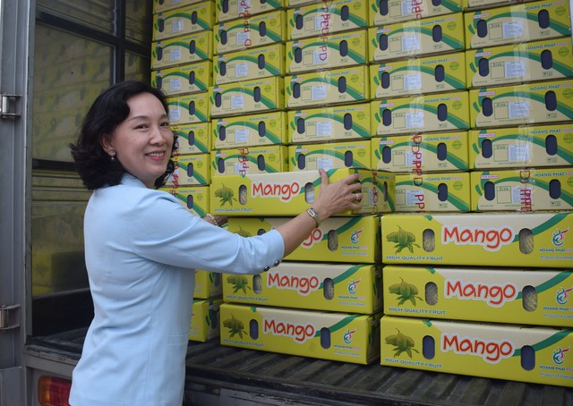 Bà Nguyễn Thị Minh Thúy, Phó chủ tịch UBND tỉnh An Giang, thực hiện nghi thức chuyển xoài lên xe vận chuyển xuất khẩu sang Hàn Quốc