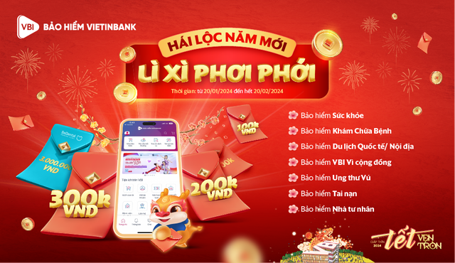 Bảo hiểm VietinBank - VBI mở đầu năm Giáp Thìn 2024 với chương trình "Hái lộc năm mới - Lì xì phơi phới" dành tặng hàng nghìn lì xì may mắn cho tất cả các khách hàng mới tham gia các sản phẩm bảo hiểm VBI (không bao gồm Bảo hiểm Vật chất ô tô, Bảo hiểm TNDS ô tô - xe máy) trên website myvbi.vn, app MyVBI và Mini App Zalo (không thông qua tư vấn viên) từ 20.01.2024 đến 20.2.2024.
