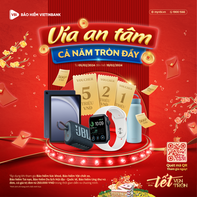 Diễn ra từ ngày 20.1.2024 đến hết ngày 20.2.2024 với tổng giá trị giải thưởng hơn 800 triệu đồng, chiến dịch "Tết vẹn tròn" là món quà đầu năm mang vía sức khỏe, an vui từ Bảo hiểm VietinBank - VBI dành tặng cho tất cả khách hàng. Với mỗi chương trình, Bảo hiểm VietinBank - VBI mang đến cho khách hàng những trải nghiệm mới từ thương hiệu bảo hiểm số sáng tạo trong dịp Tết đến xuân về.