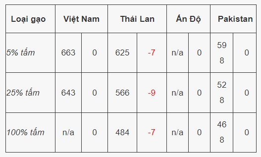 Trong khi đó giá gạo xuất khẩu của Thái Lan lao dốc nhanh chóng. Theo đó, giá gạo xuất khẩu 5% tấm giảm 7 USD xuống mức 625 USD/tấn; giá gạo loại 25% tấm giảm 9 USD xuống mức 566 USD/tấn; giá gạo loại 100% tấm giảm 7 USD xuống mức 484 USD/tấn.