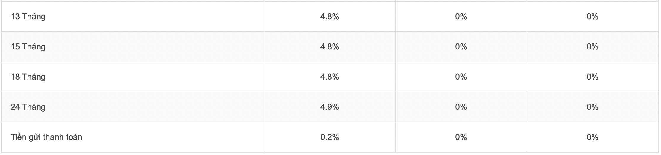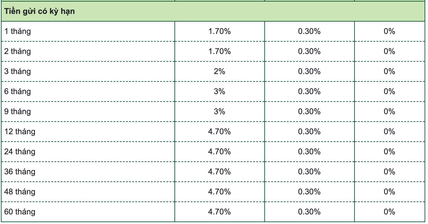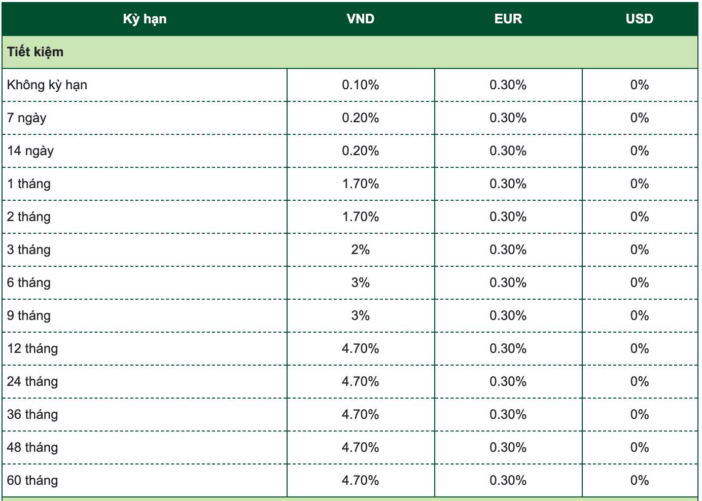 * Thông tin về lãi suất chỉ mang tính chất tham khảo và có thể thay đổi trong từng thời kỳ. Vui lòng liên hệ điểm giao dịch ngân hàng gần nhất hoặc hotline để được tư vấn cụ thể.