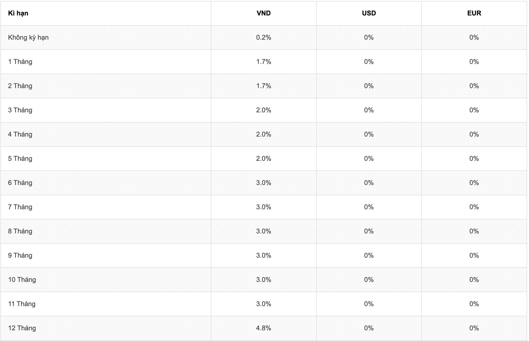 Khách hàng gửi tiền không kỳ hạn và tiền gửi thanh toán sẽ nhận lãi suất ở mức 0,2%/năm.