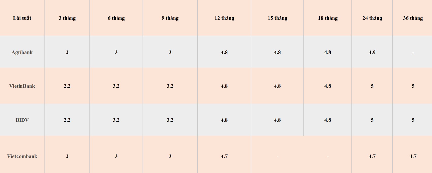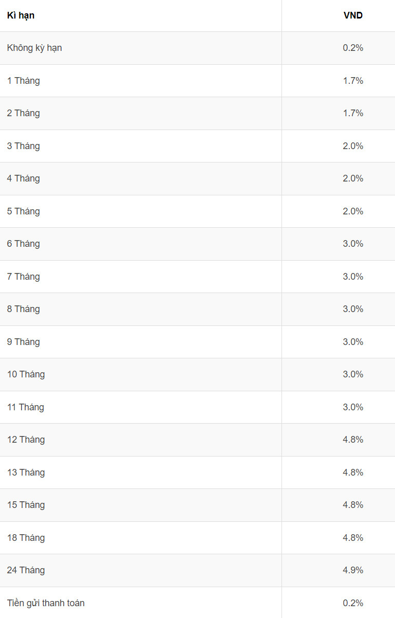 Theo đó, lãi suất không kỳ hạn được ngân hàng này niêm yết ở ngưỡng 0,2%/năm; 1-2 tháng ở ngưỡng 1,7%/năm; 3-5 tháng ở ngưỡng 2%/năm; 6-11 tháng ở ngưỡng 3%/năm; trên 12 tháng ở ngưỡng 4,9%/năm.