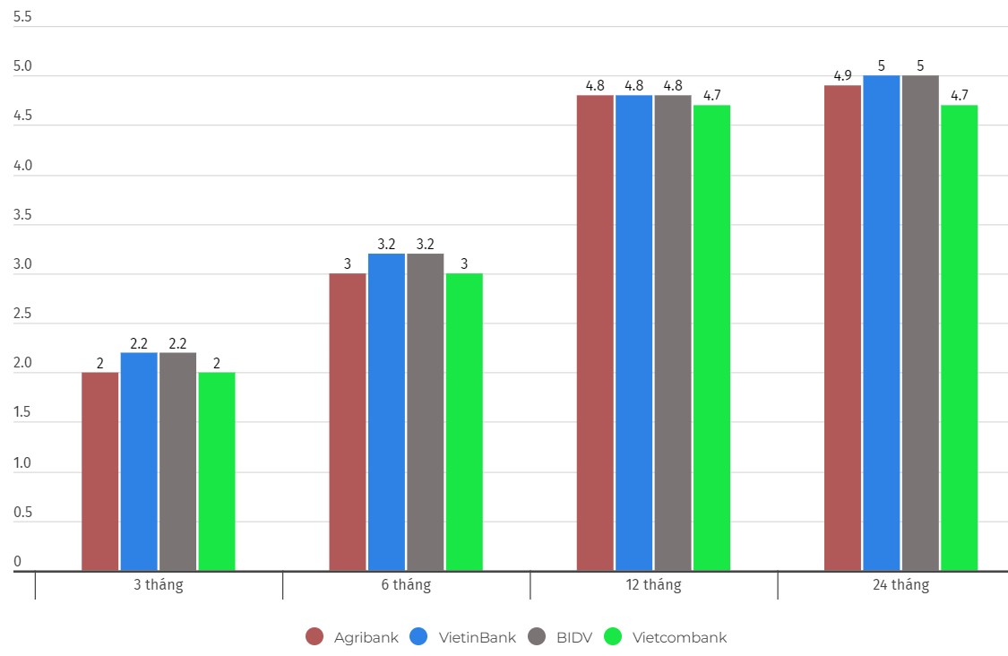 Biểu đồ lãi suất một số kỳ hạn tại Vietcombank, Agribank, VietinBank và BIDV. Số liệu ghi nhận ngày 8.3.2024. Đơn vị tính: %/năm. Biểu đồ: Khương Duy