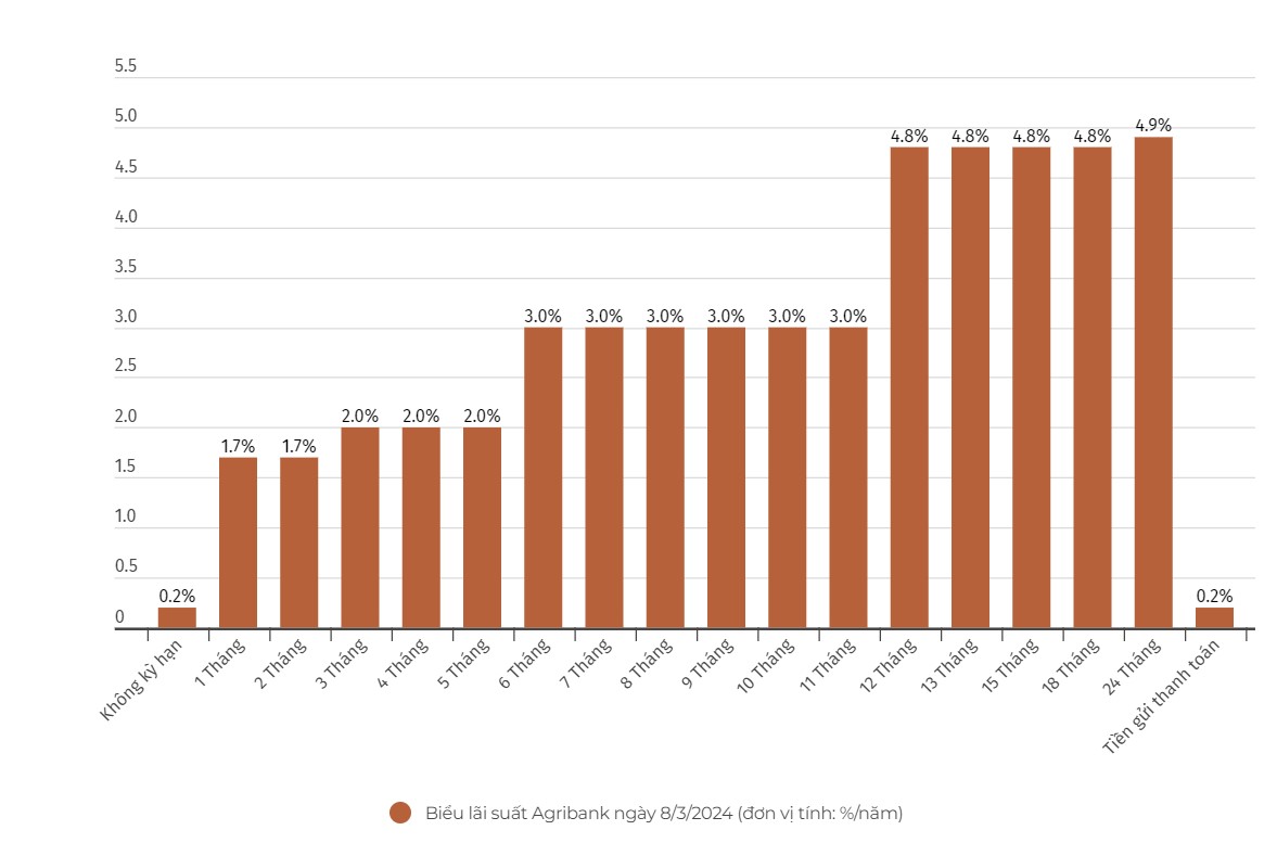 Ghi nhận của PV Lao Động ngày 8.3.2024, Agribank niêm yết lãi suất huy động quanh ngưỡng 1,7 - 4,9%/năm.