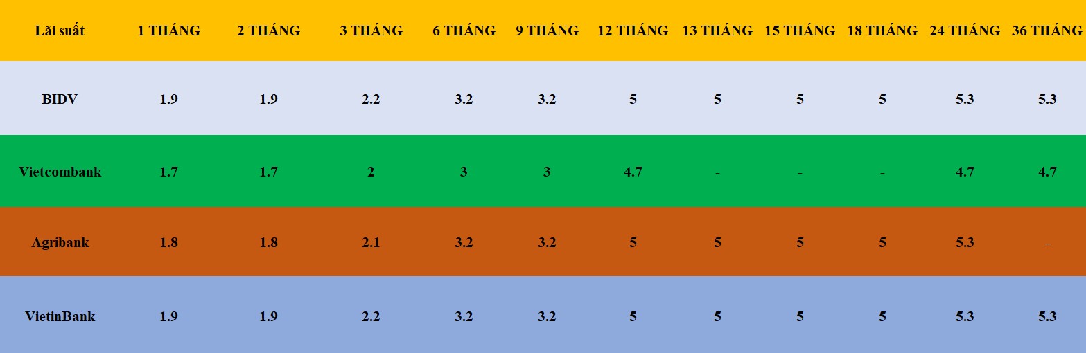 Nguồn: https://laodong.vn/tien-te-dau-tu/bien-dong-lai-suat-vietcombank-bidv-agribank-vietinbank-ngay-261-1297163.ldo