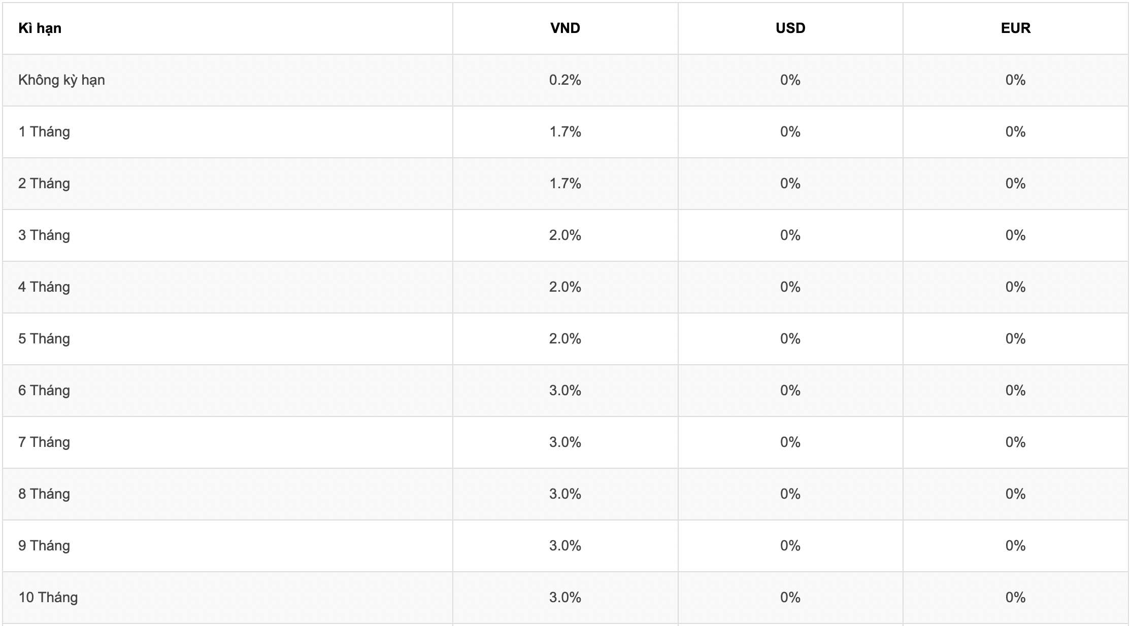 Vietcombank niêm yết lãi suất đối với khách hàng cá nhân khi gửi tiết kiệm 7 - 14 ngày nhận lãi suất 0,2%. Khách hàng gửi tiết kiệm kỳ hạn 1 và 2 tháng, Vietcombank niêm yết lãi suất ở mức 1,7%/năm. Tại kỳ hạn 3 tháng, Vietcombank niêm yết lãi suất ở mức 2%/năm.