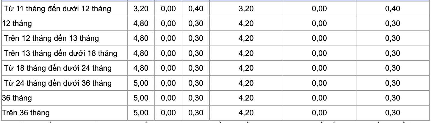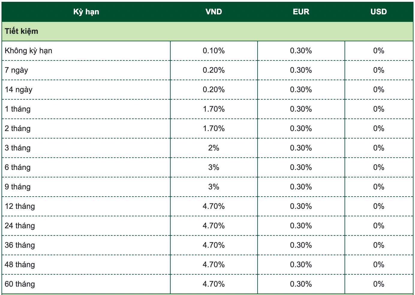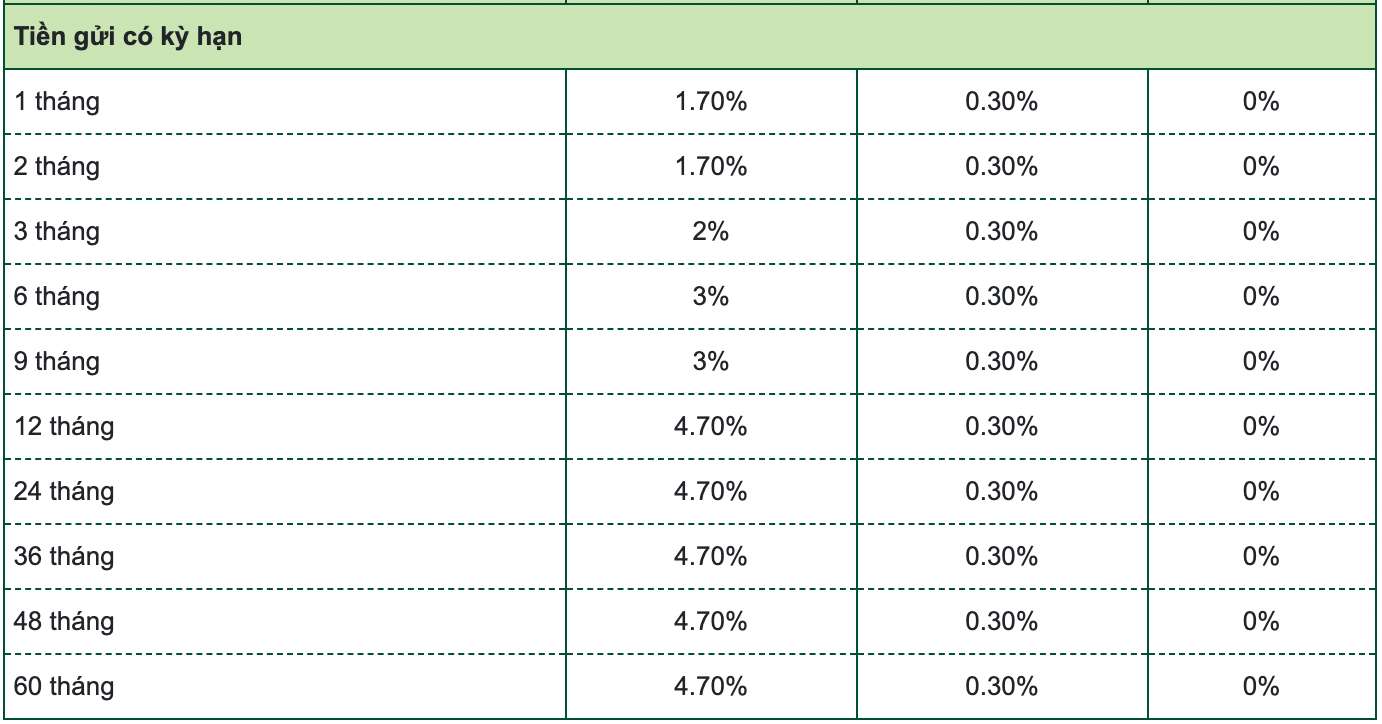 Khách hàng gửi tiền các kỳ hạn từ 6 - 9 tháng nhận lãi suất ở mức 3%/năm. Khách hàng gửi tiền từ 12 - 60 tháng nhận lãi suất cao nhất 4,7.