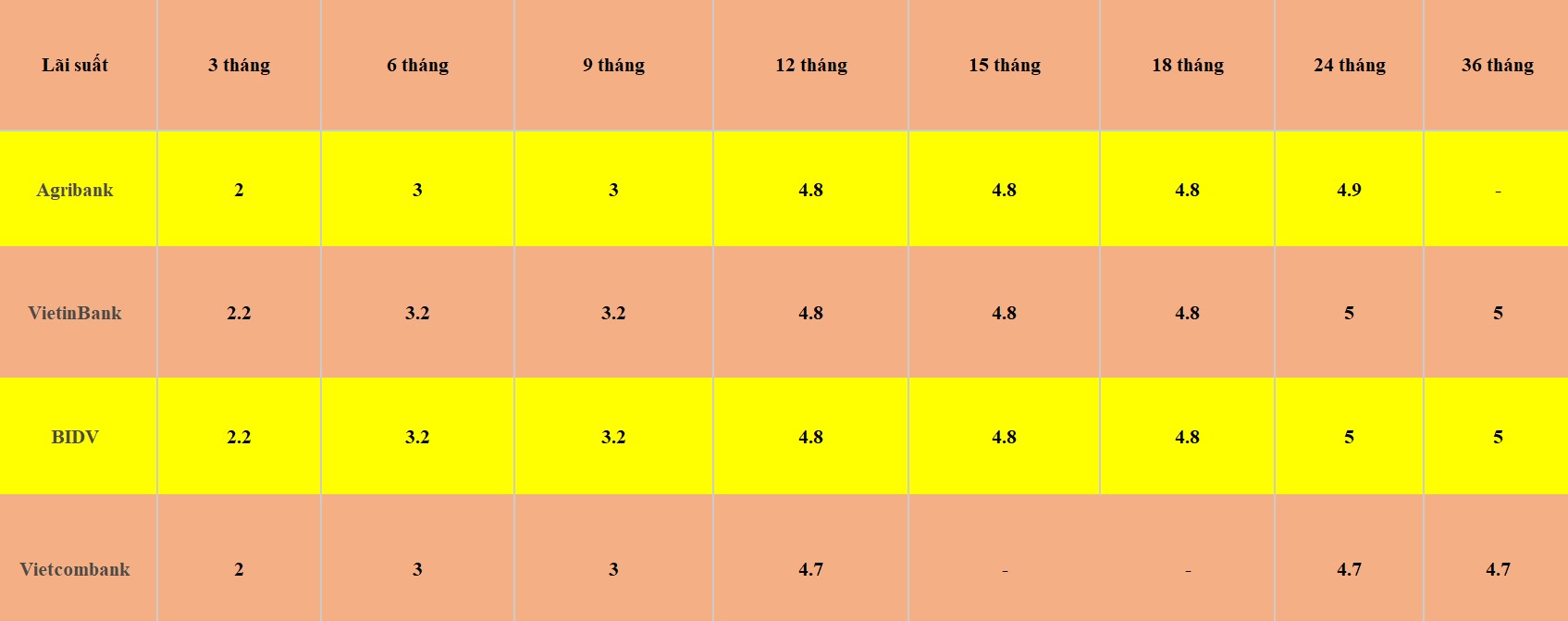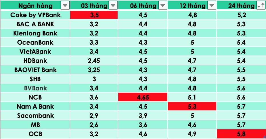 Theo đó, lãi suất không kỳ hạn được ngân hàng này niêm yết ở ngưỡng 0,1%/năm; dưới 1 tháng ở ngưỡng 0,2%/năm; 1-2 tháng ở ngưỡng 1,9%/năm; 3-6 tháng ở ngưỡng 2,2%/năm; 6 - dưới 12 tháng ở ngưỡng 3,2%/năm; 12 - dưới 24 tháng ở ngưỡng 4,8%/năm; trên 24 tháng ở ngưỡng 5%/năm.