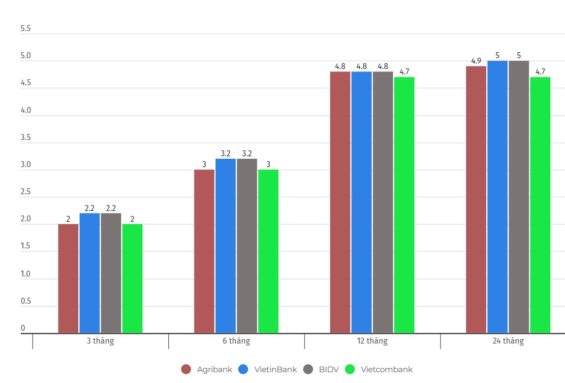 Biểu đồ lãi suất một số kỳ hạn tại Vietcombank, Agribank, VietinBank và BIDV. Số liệu ghi nhận ngày 9.3.2024. Đơn vị tính: %/năm. Biểu đồ: Khương Duy
