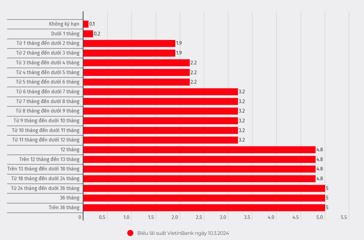 Ghi nhận của PV Lao Động ngày 10.3.2024, VietinBank niêm yết lãi suất huy động quanh ngưỡng 1,9 - 5%/năm.