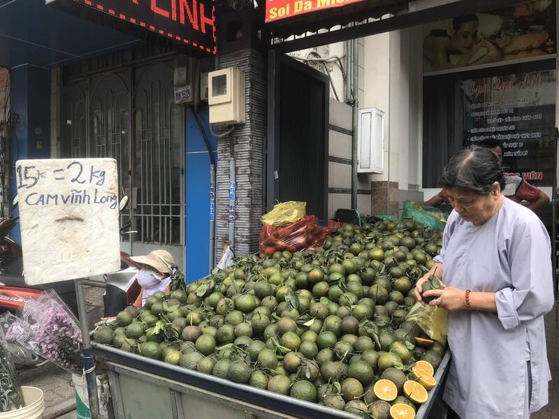 Ghi nhận tại TPHCM, nhiều xe hàng dọc các tuyến đường như Nguyễn Văn Cừ (Quận 10), Phạm Văn Đồng (TP Thủ Đức), Trần Xuân Soạn (Quận 7)… và sạp hàng tại các chợ truyền thống, cam sành được chất thành đống với mức giá bán dao động từ 5.000 đến 10.000 đồng/kg.