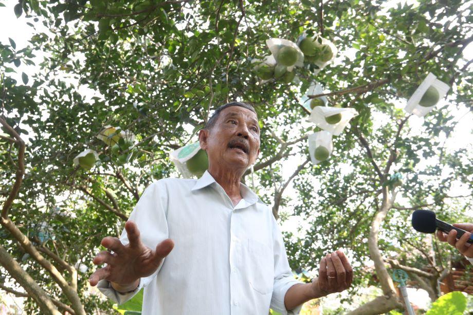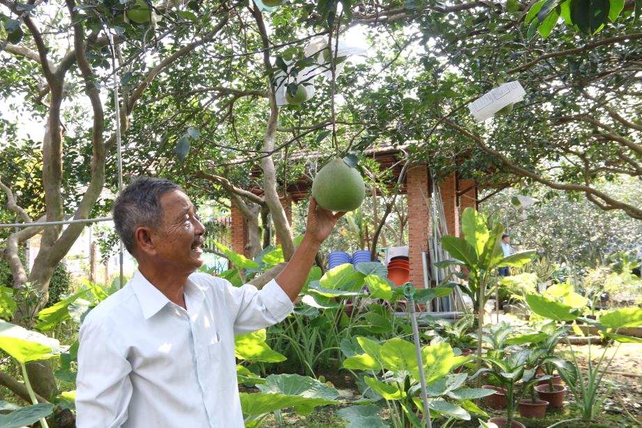 Còn đây là vườn bưởi Hai Dương của ông Võ Văn Minh, khu vườn chỉ có diện tích khoảng 2.300m2, nhưng mỗi năm cũng mang lại thu nhập hơn 200 triệu đồng.