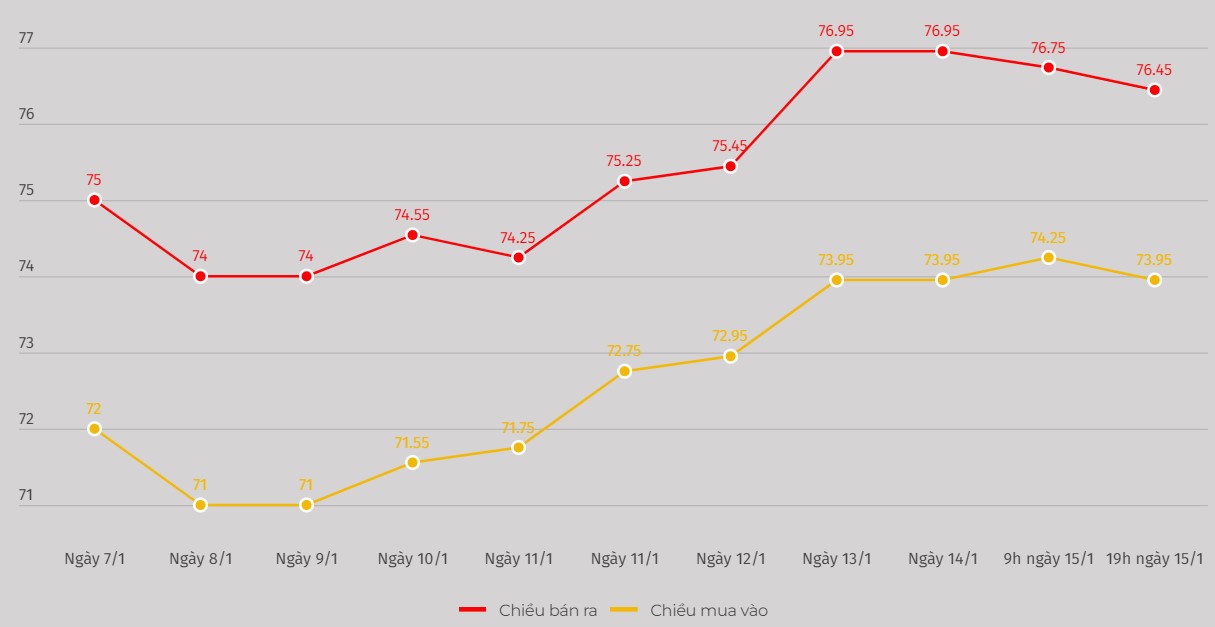 Diễn biến giá vàng trong nước. Đơn vị: Triệu đồng/lượng. Đồ họa: Khương DuyChênh lệch giá vàng mua - bán hiện nay được niêm yết ở ngưỡng 2,5 triệu đồng. Mức chênh lệch này được đánh giá là rất cao. Nhà đầu tư đối diện nguy cơ thua lỗ khi các đơn vị kinh doanh đẩy rủi ro về phía người mua.