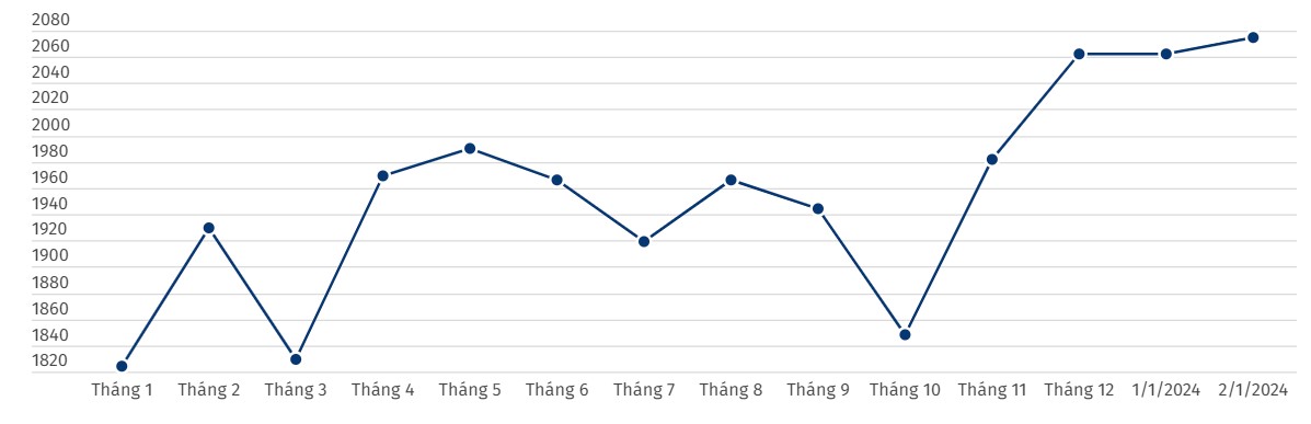 Diễn biến giá vàng thế giới năm 2023 đến nay. Đơn vị tính: USD/ounce. Biểu đồ: Phan AnhGiá vàng thế giới hồi phục phiên đầu năm bất chấp đồng USD mạnh lên. Ghi nhận lúc 18h ngày 2.1, chỉ số US Dollar Index đo lường biến động của đồng bạc xanh với 6 đồng tiền chủ chốt ở ngưỡng 101,352 điểm (tăng 0,32%).