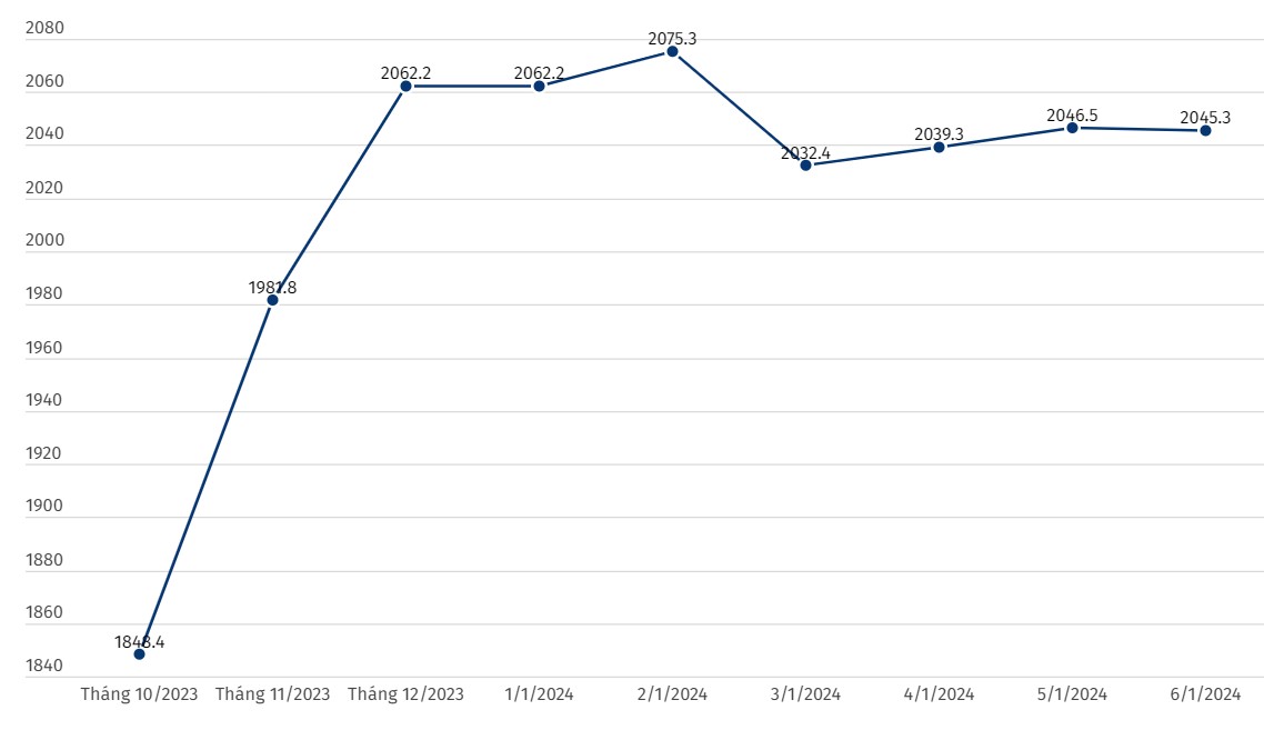 Diễn biến giá vàng thế giới. Đơn vị tính: USD/ounce. Biểu đồ: Phan AnhGiá vàng thế giới không có thay đổi trong bối cảnh đồng USD đi ngang. Ghi nhận lúc 19h45 ngày 6.1, chỉ số US Dollar Index đo lường biến động của đồng bạc xanh với 6 đồng tiền chủ chốt ở ngưỡng 102,145 điểm (tăng 0,01%).