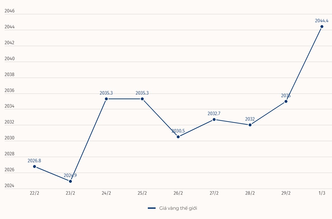 Dữ liệu thị trường nhà ở đáng thất vọng đang giúp vàng giữ ở mức cao, có thời điểm lên trên 2.050 USD/ounce. Giá vàng kỳ hạn tháng 4 được giao dịch lần cuối ở mức 2.059 USD/ounce, tăng 0,8% trong ngày.