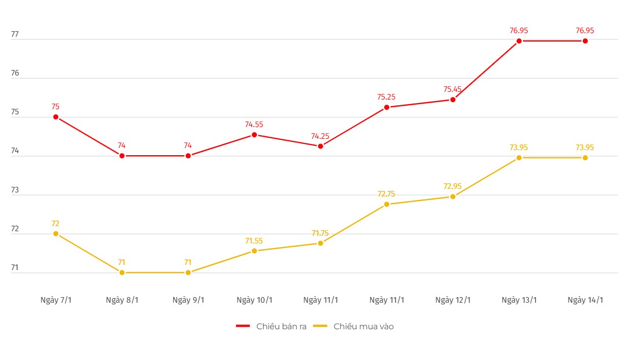 Diễn biến giá vàng trong nước. Đơn vị: Triệu đồng/lượng. Đồ họa: Khương DuyChênh lệch giá vàng mua - bán hiện nay được điều chỉnh tăng lên ngưỡng 3 triệu đồng. Mức chênh lệch này được đánh giá là rất cao. Nhà đầu tư đối diện nguy cơ thua lỗ khi các đơn vị kinh doanh đẩy rủi ro về phía người mua.