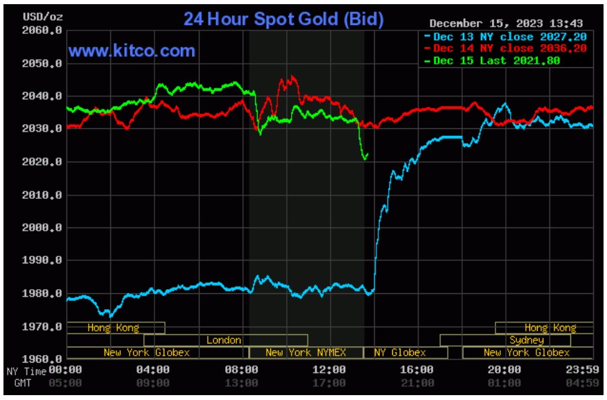 Nguồn: KitcoGiá vàng thế giới chịu áp lực trong bối cảnh đồng USD tăng mạnh. Ghi nhận lúc 1h45 ngày 16.12, chỉ số US Dollar Index đo lường biến động của đồng bạc xanh với 6 đồng tiền chủ chốt ở ngưỡng 102,217 điểm (tăng 0,62%).