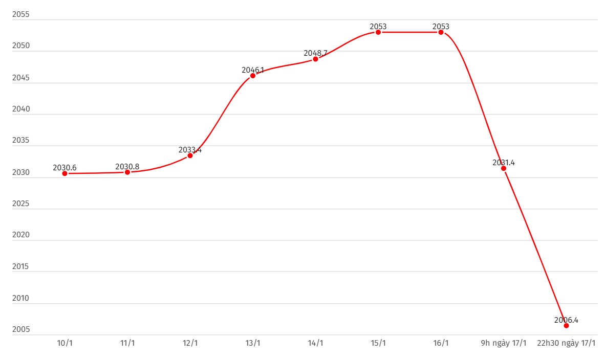 Diễn biến giá vàng thế giới. Đơn vị tính: USD/ounce. Biểu đồ: Phan AnhGiá vàng thế giới rơi tự do khi đồng USD tăng mạnh. Ghi nhận lúc 22h30 ngày 17.1, chỉ số US Dollar Index đo lường biến động của đồng bạc xanh với 6 đồng tiền chủ chốt ở ngưỡng 103,389 điểm (tăng 0,26%).