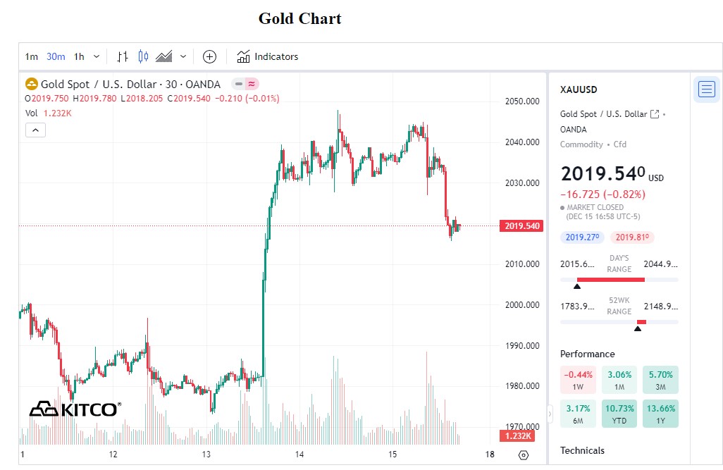 Nguồn: KitcoGiá vàng thế giới chịu áp lực trong bối cảnh đồng USD tăng mạnh. Ghi nhận lúc 6h ngày 18.12, chỉ số US Dollar Index đo lường biến động của đồng bạc xanh với 6 đồng tiền chủ chốt ở ngưỡng 102,225 điểm (tăng 0,64%).