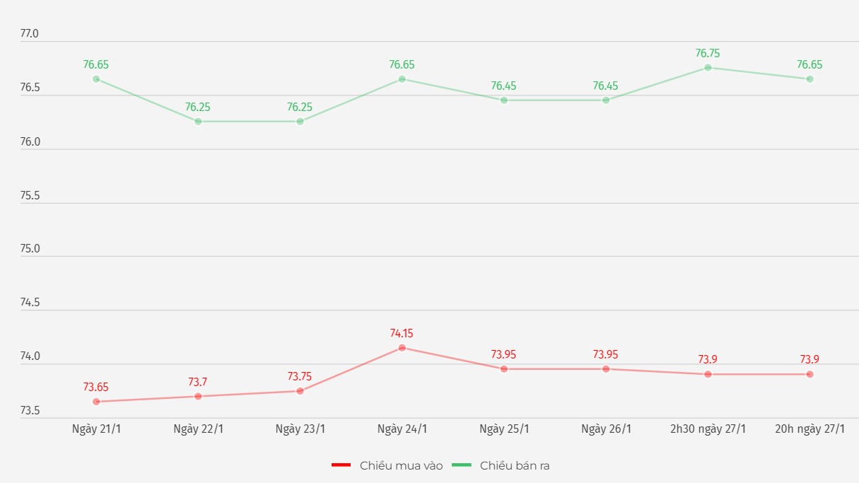 Diễn biến giá vàng trong nước. Đơn vị: Triệu đồng/lượng. Đồ họa: Khương DuyChênh lệch giá vàng mua - bán hiện nay được niêm yết ở ngưỡng 2,75 triệu đồng/lượng. Mức chênh lệch này được đánh giá là rất cao. Nhà đầu tư đối diện nguy cơ thua lỗ khi các đơn vị kinh doanh đẩy rủi ro về phía người mua.