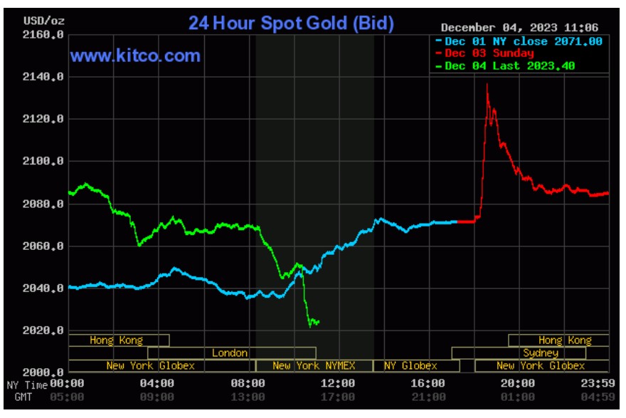 Nguồn: KitcoGiá vàng thế giới "rơi tự do" trong bối cảnh đồng USD tăng mạnh. Ghi nhận lúc 23h06 ngày 4.12, chỉ số US Dollar Index đo lường biến động của đồng bạc xanh với 6 đồng tiền chủ chốt ở ngưỡng 103,742 điểm (tăng 0,53%).
