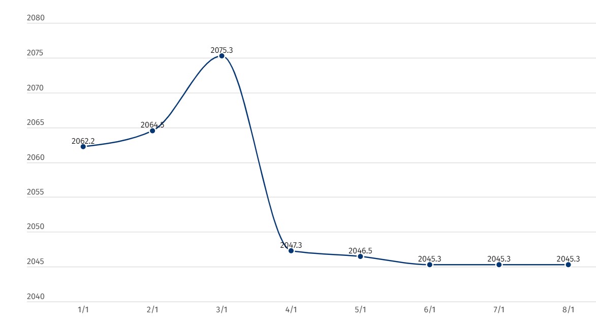 Diễn biến giá vàng thế giới. Đơn vị tính: USD/ounce. Biểu đồ: Phan AnhGiá vàng thế giới ghi nhận tuần đi xuống đầu tiên trong một tháng qua. Chốt phiên cuối tuần, vàng không có nhiều thay đổi trong bối cảnh đồng USD gần như đi ngang. Ghi nhận lúc 5h30 ngày 8.1, chỉ số US Dollar Index đo lường biến động của đồng bạc xanh với 6 đồng tiền chủ chốt ở ngưỡng 102,049 điểm (giảm 0,09%).
