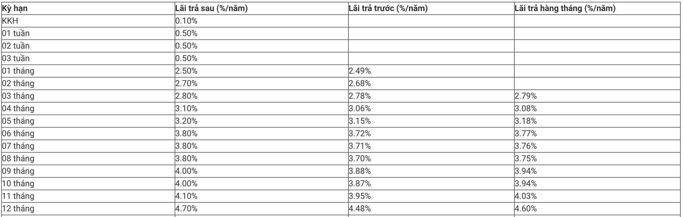* Thông tin về lãi suất chỉ mang tính chất tham khảo và có thể thay đổi trong từng thời kỳ. Vui lòng liên hệ điểm giao dịch ngân hàng gần nhất hoặc hotline để được tư vấn cụ thể.
