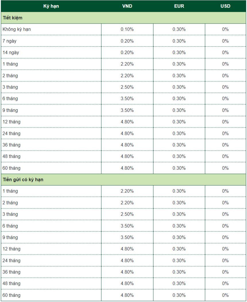 Ngân hàng này niêm yết lãi suất không kỳ hạn ở ngưỡng 0,1%/năm; 7 ngày, 14 ngày ở ngưỡng 0,2%/năm; 1-2 tháng ở ngưỡng 2,2%/năm; 3 tháng ở ngưỡng 2,5%/năm; 6 và 9 tháng ở ngưỡng 3,5%/năm; các kỳ hạn từ 12 đến 60 tháng ở ngưỡng 4,8%/năm.