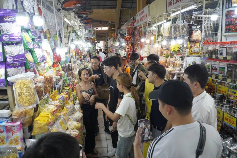Các Tiktoker tham quan, trò chuyện với tiểu thương chợ Bến Thành. Ảnh: Ngọc LêTương tự, nhà sáng tạo nội dung Vinh Gấu với 2,1 triệu lượt theo dõi trên nền tảng Tiktok cho biết, trước ngày phát trực tiếp, anh đã đến chợ Bến Thành tham quan và trò chuyện với các tiểu thương, đồng thời chuẩn bị sớm các nội dung để có buổi làm việc hiệu quả vào ngày 15.12. “Chúng tôi đến đây với mong muốn giúp các tiểu thương bán được nhiều hàng, tăng doanh thu, nhất là vào dịp cuối năm” - Vinh Gấu nói.