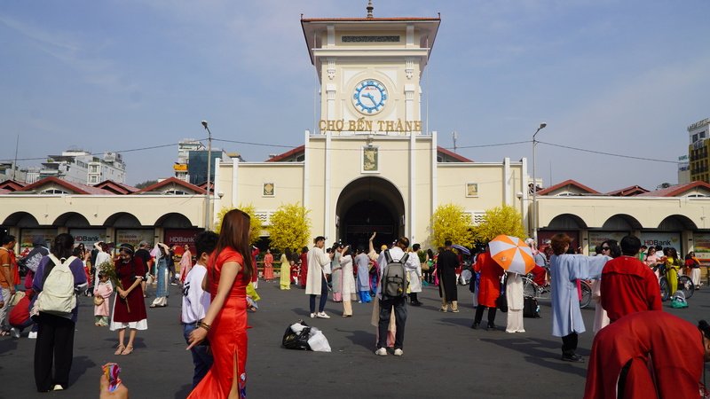 Phía trước cổng chính chợ Bến Thành cũng nhộn nhịp các bạn trẻ mặc những bộ áo dài để tạo dáng, chụp hình. Nguồn: https://laodong.vn/photo/cho-ben-thanh-tap-nap-khach-quoc-te-trong-nhung-ngay-cuoi-nam-am-lich-1292381.ldo