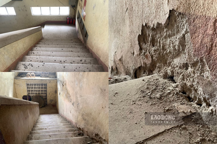 Tường, cầu thang đi lên các tầng của khu chợ cũng đã có dấu hiệu xuống cấp dẫn đến khó cạnh tranh với các loại hình kinh doanh hiện đại và đa dạng. Ảnh: Hồng NguyênNguồn: https://laodong.vn/photo/cho-truyen-thong-yen-bai-xuong-cap-tieu-thuong-ngu-gat-vi-vang-khach-e-am-1305796.ldo
