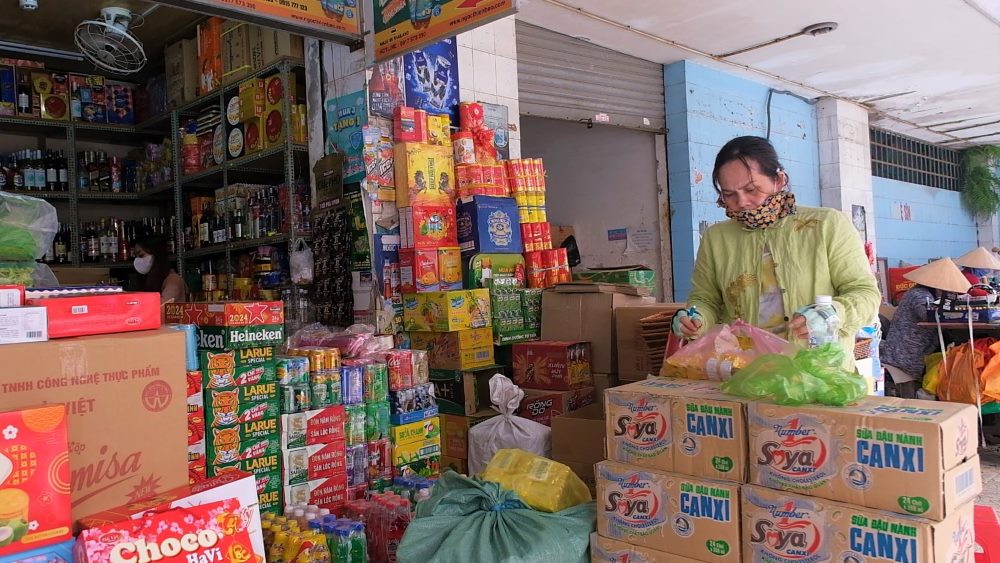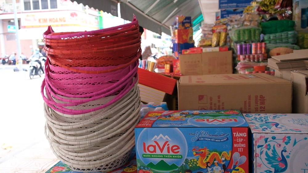 Chị Thoa kiểm tra hàng hóa chuẩn bị cho dịp Tết Nguyên đán 2024. Ảnh: Phong Linh"Khách vãng lai mua hàng rất ít, chủ yếu là mối sỉ ở các vùng ven. Vì lẽ đó mà tôi cũng không dám gói giỏ quà Tết như các năm trước, dù đã mua sẵn giỏ, hộp đựng, bao bì, đồ trang trí,... Thứ nhất là tôi không có trữ nhiều hàng hóa, thứ hai là sợ gói sẵn mà không ai mua. Nếu như các năm trước, chúng tôi gói sẵn giỏ quà Tết để bán dần từ đầu tháng Chạp thì hiện nay ai đặt hàng chúng tôi mới gói để đảm bảo không phí công", chị Thoa chia sẻ.