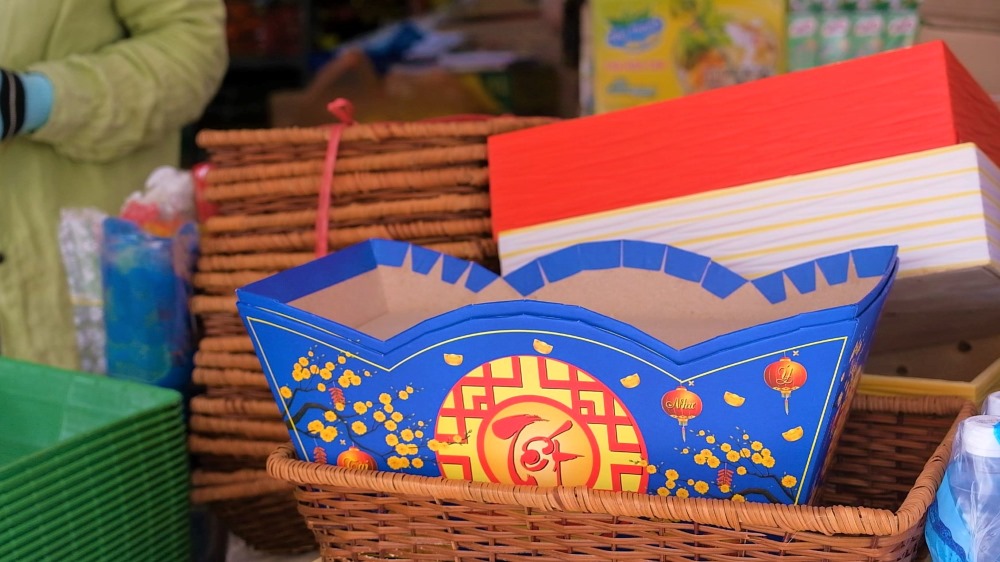 Giỏ quà đã được chuẩn bị nhưng vẫn chưa gói. Ảnh: Phong Linh