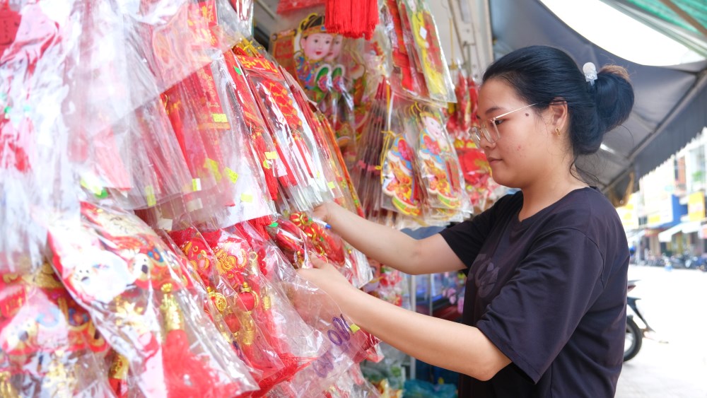 Chị Nhi sắp xếp lại mặt hàng tài lộc để thu hút khách hàng. Ảnh: Phong Linh.Mặt hàng tài lộc cũng kém khách mua trong những ngày cận Tết này. Chị Lê Trần Thảo Nhi (buôn bán tại chợ Cái Khế) cho hay: "Mức giá ở cửa hàng dao động từ 30.000 đến 300.000 đồng nhưng khách vẫn kén chọn và trả giá. Chúng tôi rất lo vì sáng mở cửa, tối đóng cửa đều phải đóng tiền mà buôn bán thì ngày một khó", chị Nhi cho biết.