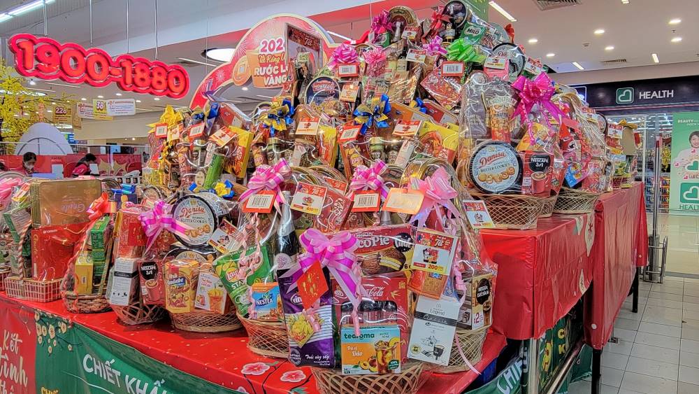 Giỏ quà Tết lên kệ tại siêu thị. Ảnh: Phong LinhTương tự như nhiều năm, quà Tết phần lớn sản phẩm sản xuất trong nước, chủ yếu là bánh kẹo, mứt, trà, rượu, các loại hạt, cà phê, nước ngọt, dầu ăn… Các loại nông sản, trái cây sấy, đặc sản vùng miền, sản phẩm OCOP cũng xuất hiện trong giỏ quà Tết.