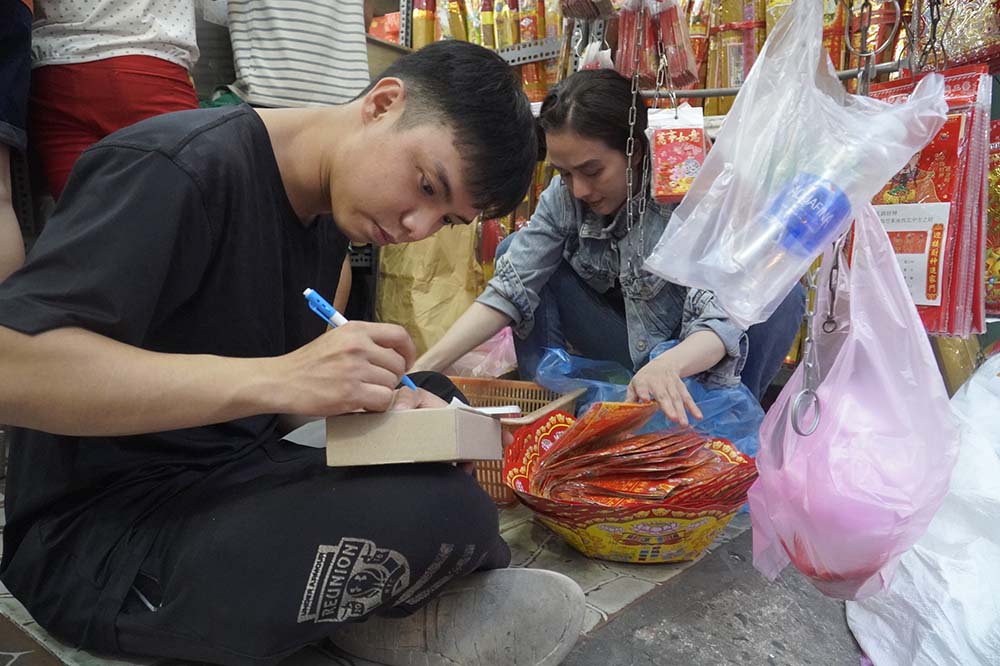 Nhân viên tại các sạp liên tục ghi chú lại các món đồ khách mua để tính tiền.