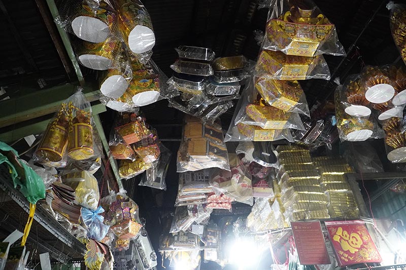 Ghi nhận của Lao Động ngày 8.2 (29 Tết), tại chợ Thiếc (Quận 11), nhiều người dân tranh thủ tới đây để mua sắm vàng mã, các vật dụng cần thiết cho mâm cúng giao thừa.