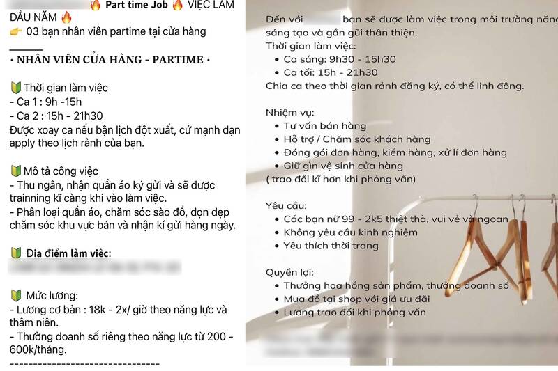 Các bài tuyển dụng nhân sự được các cửa hàng thời trang, ăn uống đăng tải liên tục. Ảnh chụp màn hìnhKhảo sát cho thấy, tại các cửa hàng kinh doanh ăn uống, thời trang nhu cầu tuyển nhân viên tập trung ở độ tuổi từ 18-27. Mức lương dao động 3-5 triệu đồng/tháng.