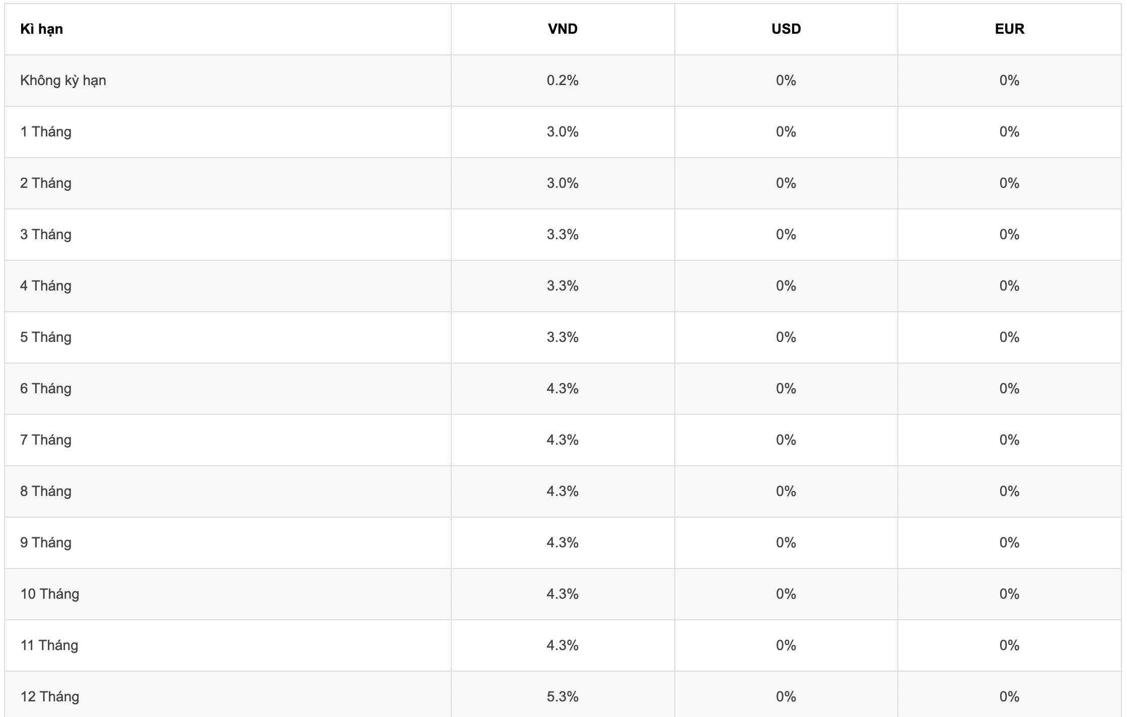 Agribank và BIDV niêm yết lãi suất tại kỳ hạn 1 tháng, 2 tháng ở mức 3%/năm. Tại các kỳ hạn 3 - 5 tháng, Agribank và BIDV niêm yết lãi suất ở mức là 3,3%/năm.