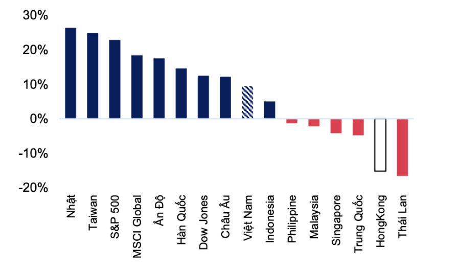 Thực tế dù trải qua một năm biến động mạnh nhưng ông Lê Ngọc Hưng - chuyên viên phân tích, Công ty Chứng khoán MB (MBS) - cho biết, thị trường chứng khoán Việt Nam (+10,7%) vẫn có hiệu quả đầu tư tốt hơn các thị trường khác trong khu vực như Thái Lan (-16,6%), Trung Quốc (-4,8%), Singapore (-4,2%), Philippines (-1,3%)...