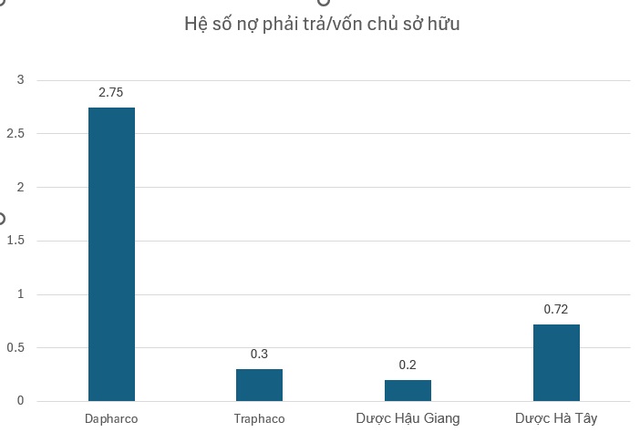 So với một số doanh nghiệp cùng ngành dược khác, có thể thấy hệ số D/E của Dapharco là tỉ lệ đáng lưu tâm. Chẳng hạn, hệ số D/E của Công ty Cổ phần Dược Hậu Giang là 0,2 (BCTC quý IV/2023); Công ty Cổ phần Traphaco là 0,3 (BCTC quý III/2023); Công ty Cổ phần Dược phẩm Hà Tây là 0,72 (BCTC quý IV/2023).