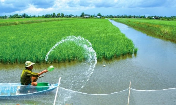 Theo các nhà khoa học, ĐBSCL có thể có thêm 1 triệu ha nuôi tôm thuộc mô hình lúa - tôm tại vùng ven vào năm 2030. Ảnh: Nhật HồÔng Ngô Tiến Chương thông tin thêm, nhu cầu tôm sú trên thị trường thế giới được dự báo sẽ tiếp tục tăng cao. Do đó, chúng ta có thể tận dụng diện tích vùng nhiễm mặn đang mở rộng, do bị tác động của hạn mặn đang diễn ra, để có thể chuyển đổi thêm 1 triệu hécta đến 2030 ở các vùng giao thoa.