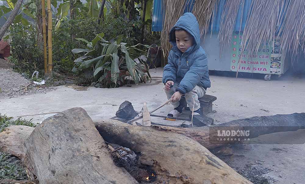 Một đứa trẻ được mẹ đốt lửa cho ngồi sưởi ấm để chống lại cái lạnh đầu mùa.