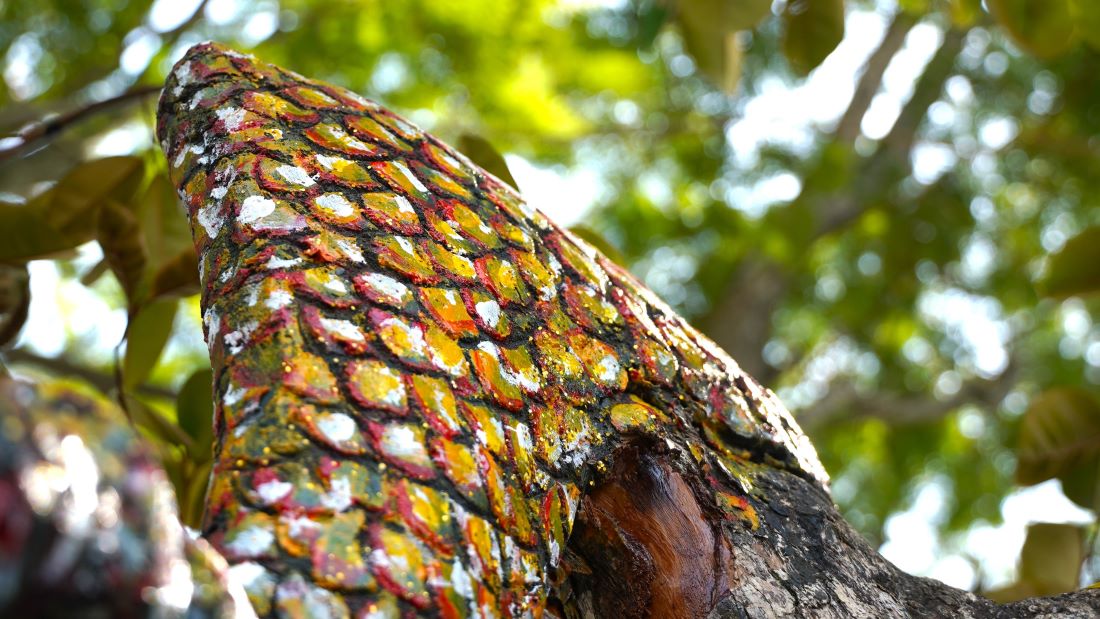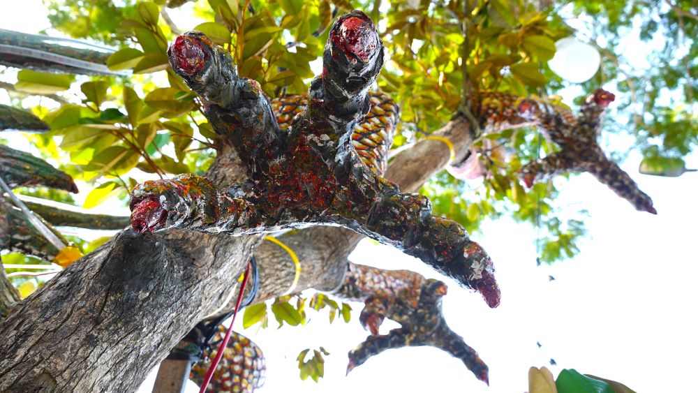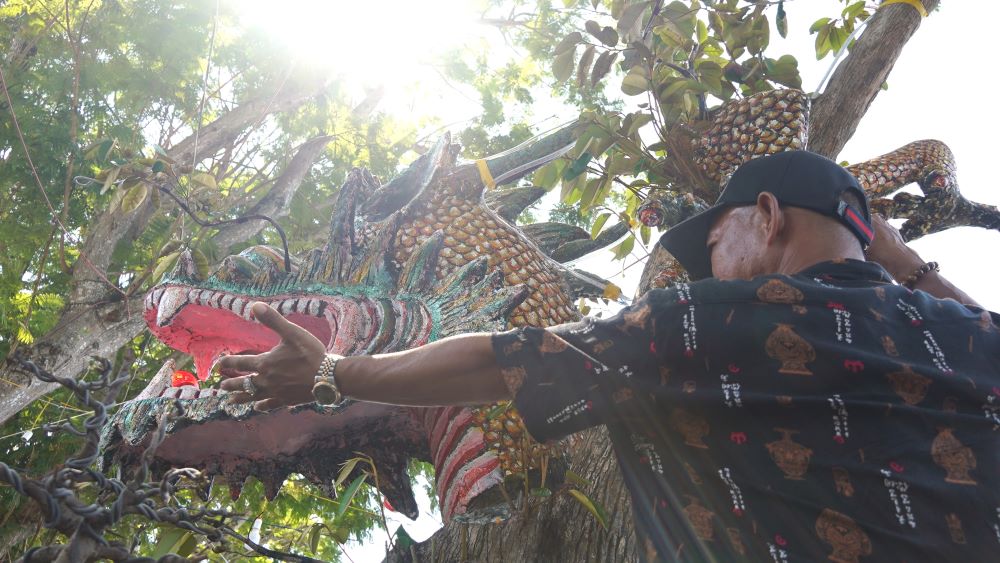Anh Cường cho hay, cây vú sữa này anh mua trong nhà vườn đã có dáng hình giống con rồng, rồi anh về tạo thêm chi tiết để cho hoàn chỉnh. Bên trong bộ phận đầu, chân, đuôi là khung sắt còn bên ngoài đắp xi măng (có chừa đường thở cho cây sống).
